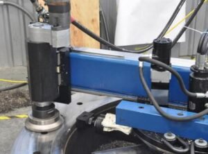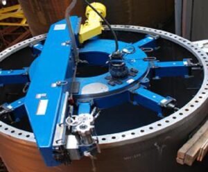 Portable machine tool for on-site machining of steel, copper, stainless steel flanges. Modular design allows versatile installation. Features high-precision components, heavy-duty bearings, and powerful motor for precise, high-force machining.